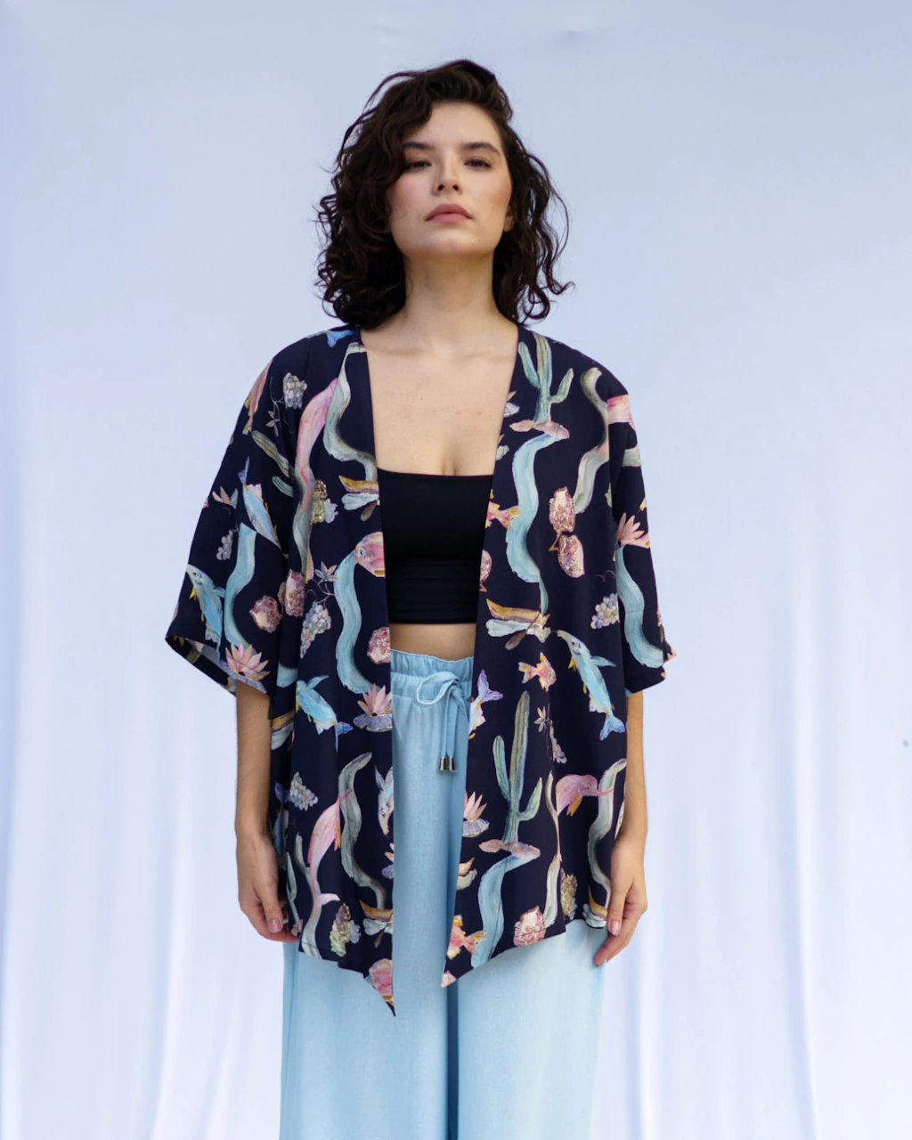Modelagem ampla, confortável, e levemente alongada na frente, para permitir que seja usado com nózinho também. Acabamento em revel, perfeito para usar aberto. Dá para combinar como terceira peça, fechado como blusa e até na praia ou piscina. Acompanha faixa de amarrar da mesma estampa. Um kimono fluido e de caimento leve.
