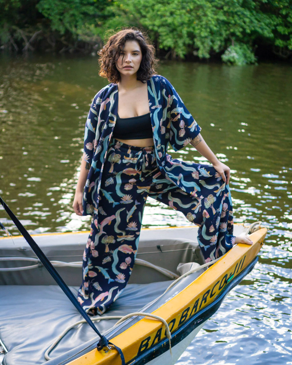 A Estampa BELEZAS DO RIO é uma criação inspirada nos elementos que correm nas águas dos rios São Francisco e Amazonas. Um no Nordeste, outro no Norte (Amazônia), unidos em uma estampa que representa essas duas forças mananciais que dão vida à fauna e à flora do Brasil. Essa estampa foi criada especialmente em celebração a nossa participação na COP30.