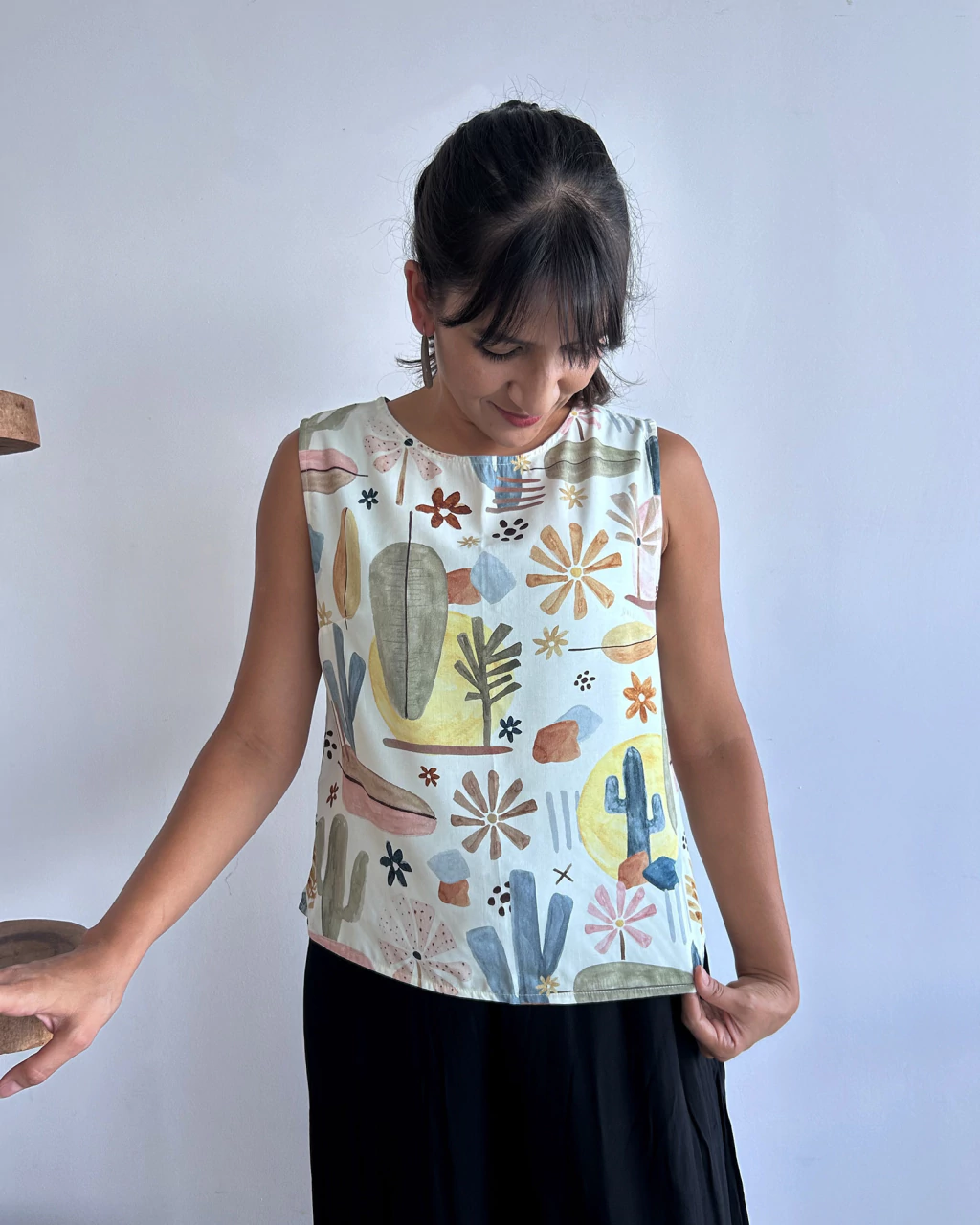Conheça nossa Regata na estampa Terramor, a nossa clássica mais amada. Modelo básico, perfeito para o dia a dia, com detalhes charmosos e funcionais. Para usar na rotina e deixar a pele respirar. Essa é uma blusa regata reta, com costura na parte de trás, e pequena abertura na lateral para dar mais liberdade de movimento. A pence no busto garante um encaixe perfeito, do P ao XGG.