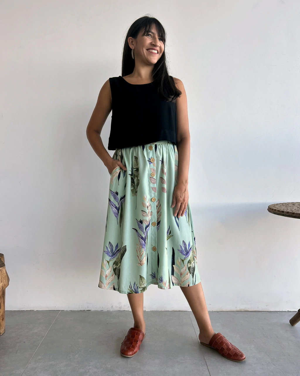 Nossa Saia Midi tem uma modelagem super confortável, que se ajusta bem a vários corpos, com elástico na parte de trás da cintura e botões reais por todo o comprimento. Dá pra usar tudo fechado ou com uma fenda na lateral. Os bolsos são nossa marca registrada e foram desenhados para caber celular, chaves e pequenos objetos com conforto.