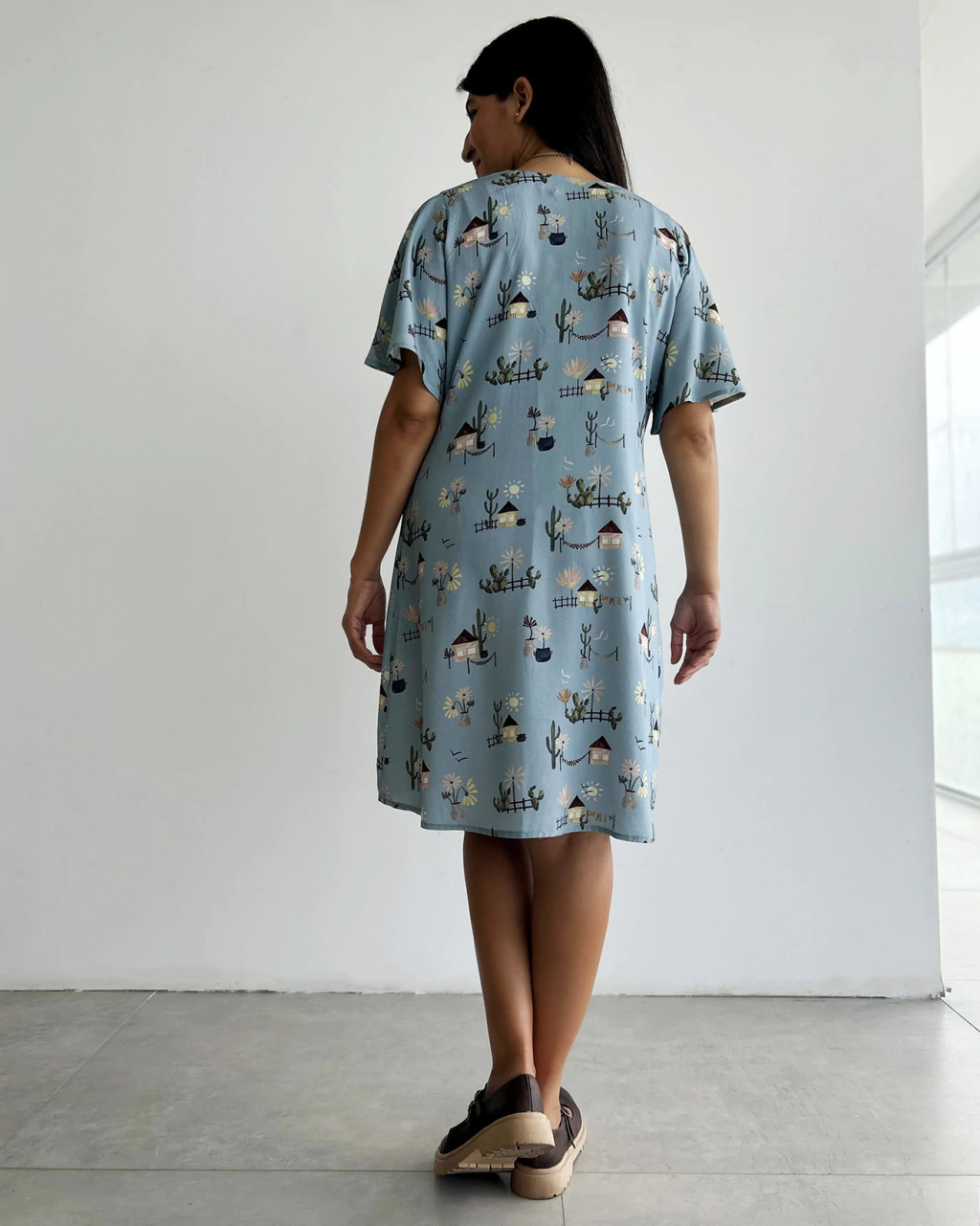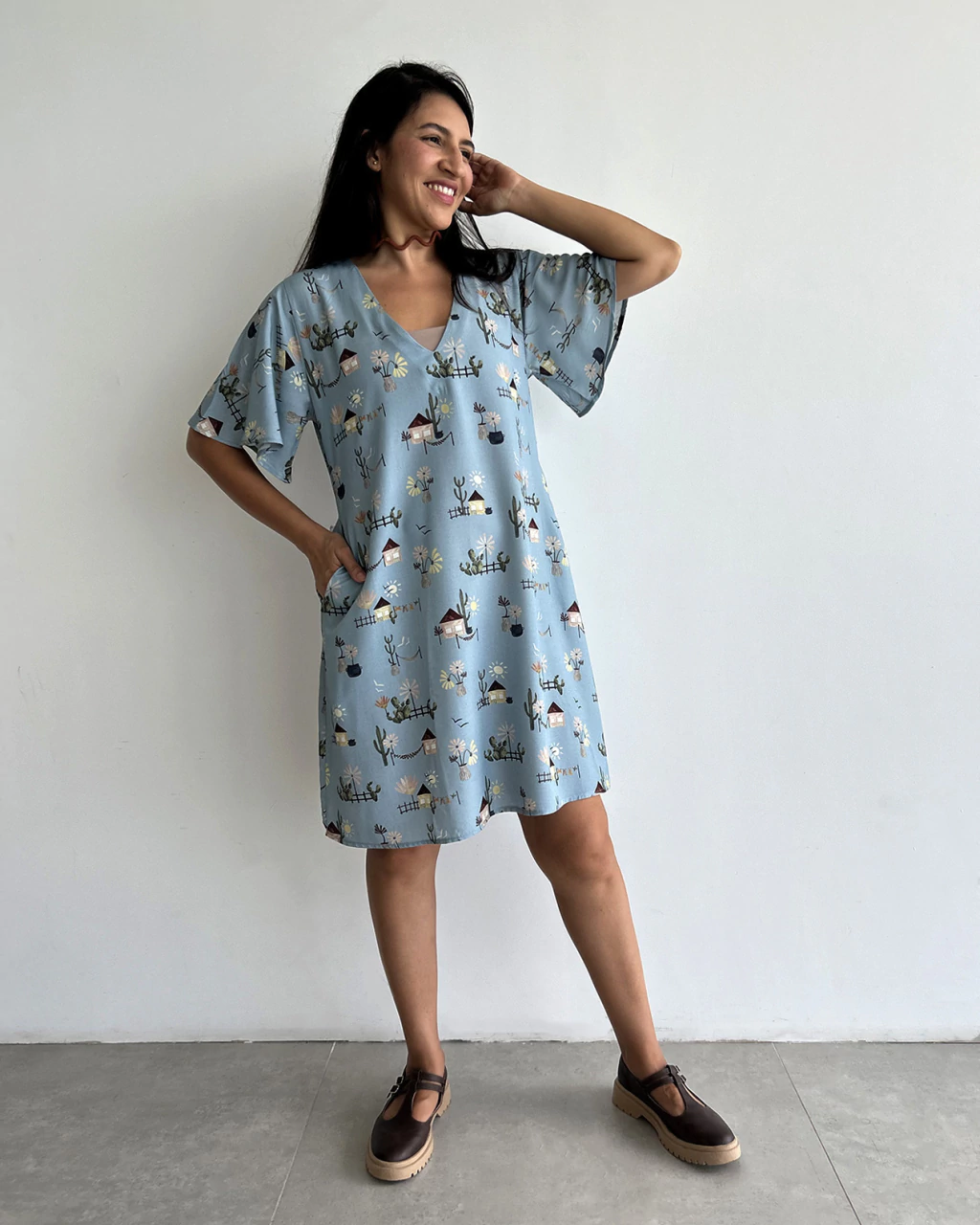 Vestido Nice na nova estampa Nosso Quintal, que retrata a simplicidade da vida na infância. De forma lúdica, ele traz elementos comuns da cultura Nordestina, de forma lúdica e com um toque de nostalgia.